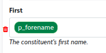 Assume we now apply a mapping to the 'source' field, and the mapping sheet we use has many columns. The first contains the value we are mapping from, and the other columns are the values you'd like to use in our import. To reference those other columns, we add _a, _b, _c etc. to the source. To do this, double click on the 'pill' - the green p_forename in this case. A raw merge field editor will pop up so you can add a suffix, i.e. the field becomes: [COLUMN: p_forename_b] or [COLUMN: p_forename_e].
