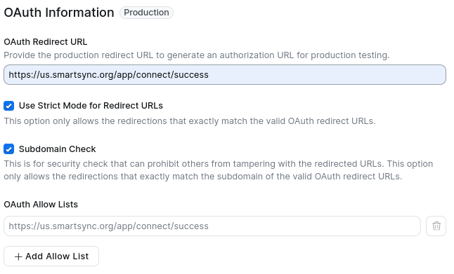 - In the 'OAuth Redirect URL' you will need to enter the redirect URL for your SmartSYNC server. Visit SmartSYNC and in the footer of the page you will see Host: ... i.e. Host: us.smartsync.org. You can use this to find your OAuth Redirect URL: