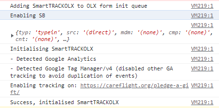 To test that tracking is working you should place a pledge (or real donation) using your donation form and again review the console. You should see information such as the below, you can expand the data by clicking on the arrows to see more detail: